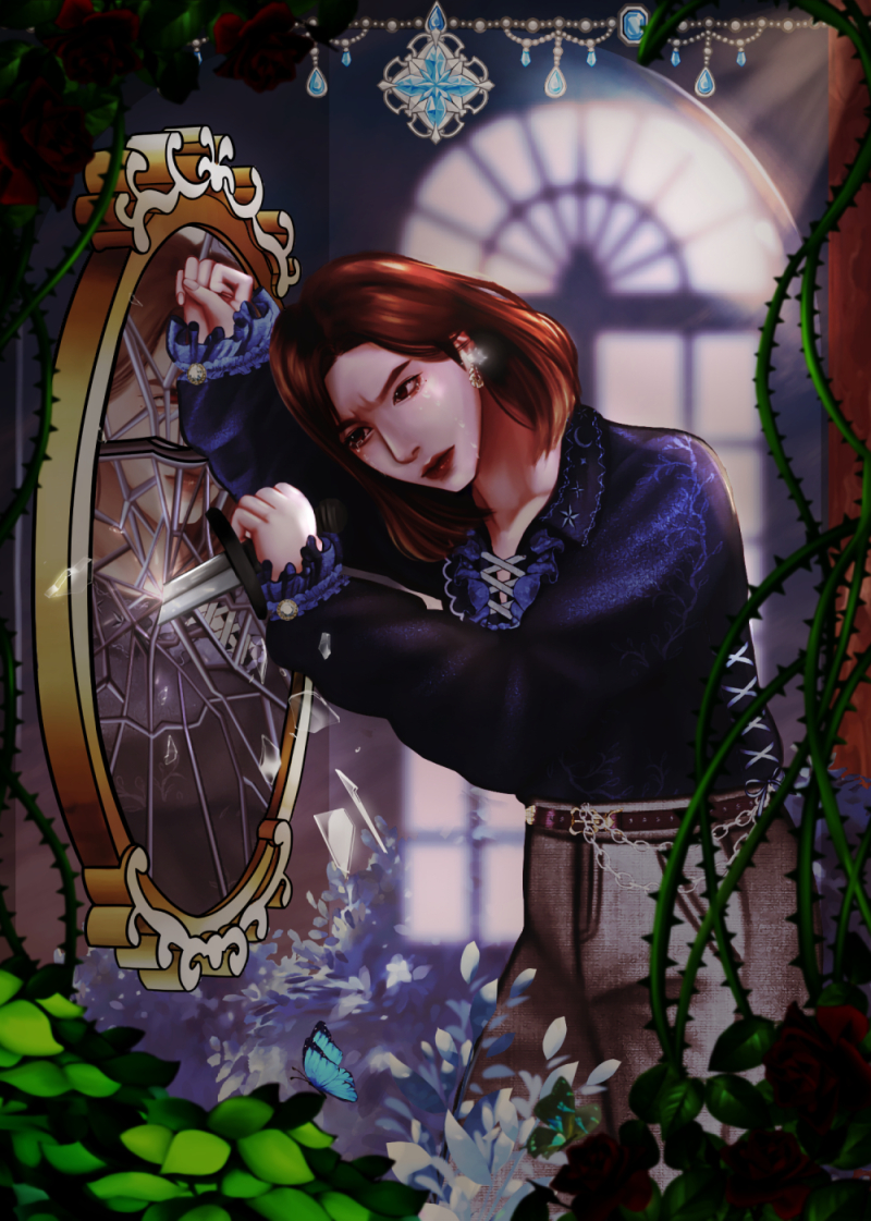 물리적으로 유리관에 갇힌 주인공 남자는 거울 속에서 자신의 모습과 똑같은 도플갱어가 자신을 향해 웃고 있는 지옥 같은 상황에 처해 있다. 주인공은 자신이 늘 지니고 다니던 단도를 꺼내 도플갱어를 죽이기 위해 거울을