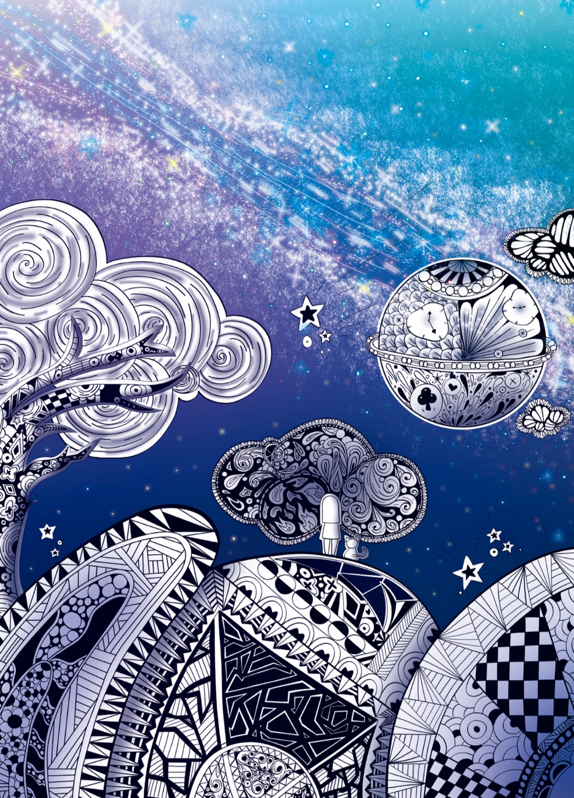 이 작품은 우주와 자연을 패턴으로 재해석한 이차원 앨리스 환상적 풍경이다. 정교한 흑백 문양과 푸른 우주가 대비되며, 현실과 상상의 경계를 넘나드는 꿈같은 분위기이다. 관람자는 다양한 패턴 속에서 각자의 해석과 감정을 자유롭게 발견할 수 있다.